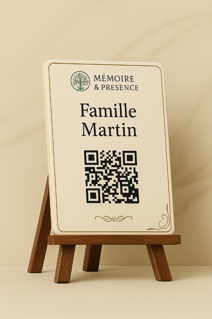 Mémoire & Présence est un service de création de plaques QR personnalisées menant vers un hommage digital. Chaque page est pensée avec délicatesse, sobriété et respect, pour offrir un espace intime de souvenir accessible partout, pour toujours.